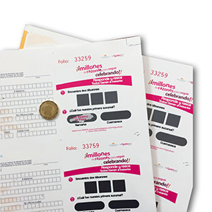 Innovamos en la producción de boletos “Raspables” con aplicación UV en México, con tiempos de secado mínimos, dato variable por boleto con folio, con perforaciones para desprender y suajados especiales lo cual nos permite ofrecer grandes volúmenes con tiempos de entrega muy cortos.